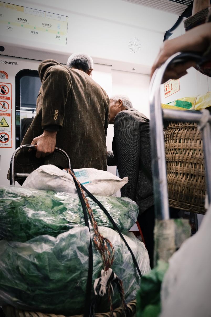 背篓专线开通前,菜农们多直接在石船镇上卖菜,因为要去一趟城里卖特别麻烦:要进主城,必经之路是319国道,该路段山路弯弯,坡坎曲折,当地人又称之为“十二拐公路”,因此要穿过这段公路必须乘坐小客车,而13块钱的车费不算便宜。更重要的是,菜农们清早出门,等通过“十二拐公路”,已临近中午,半天时间卖不了多少又得往回赶,“这笔买卖”实在不划算。好在自“背篓专线”开通以来,石船镇到市中心40公里的距离被缩短为一个小时车程,坐在地铁上又快又舒服,还可以眯一会儿。除了补觉,不少菜农还会通过跟老相识们“摆龙门阵”来打发时间,他们讲着去哪个菜市场赚钱赚的多,以及每斤菜定价多少合适。