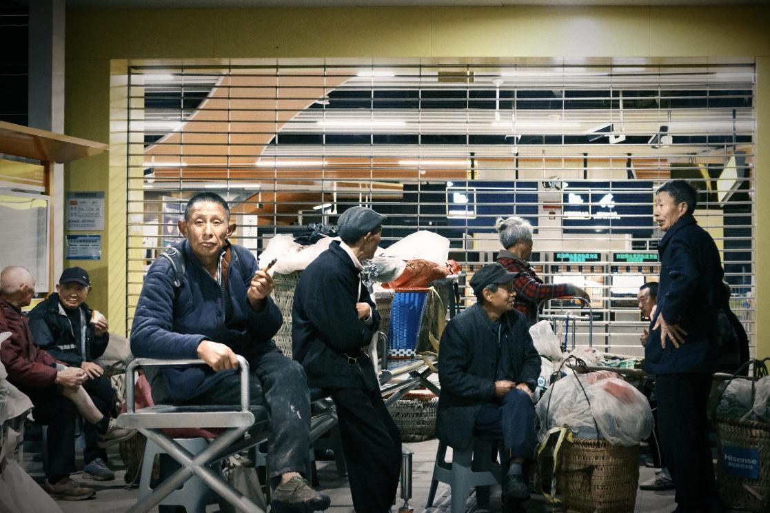 4月12日凌晨4:30左右,10余名菜农在石船镇地铁站外休息区等候