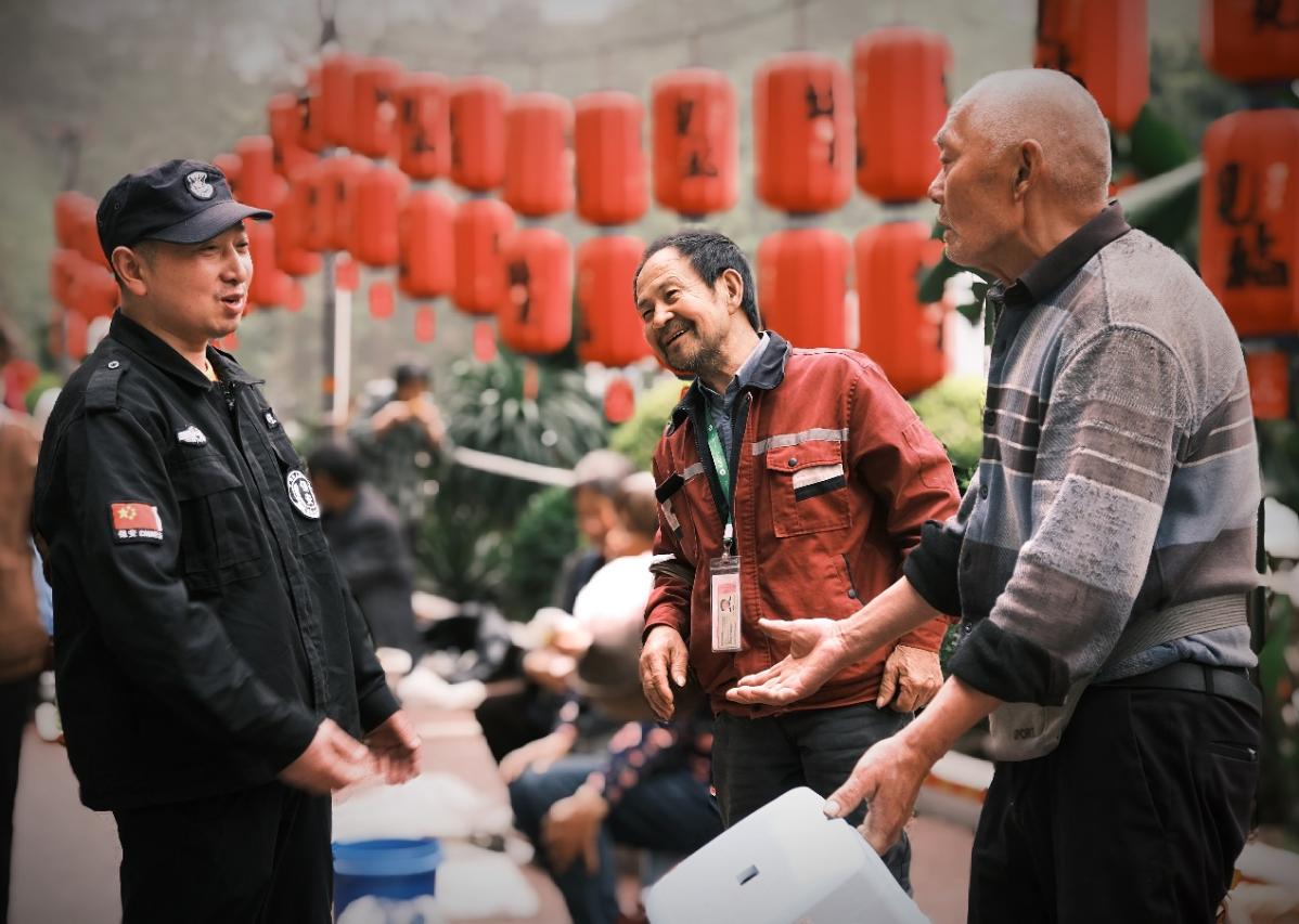 菜场保安正在与菜农唠嗑打趣