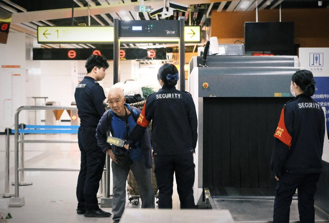来到安检处,菜农们不必放下背篓过安检装置,只需由两名工作人员为其人工安检:一名安检员帮忙扶着背篓和疏通,另一名则用安检扫描仪快速检查背篓。此外,旁边还设有一位安全员观察是否有安全隐患并及时解决。“有些农民的背篓太重了,背在后背容易往后倒,我在这儿就得看着他们,站不稳地扶一把,千万不能出事了。”