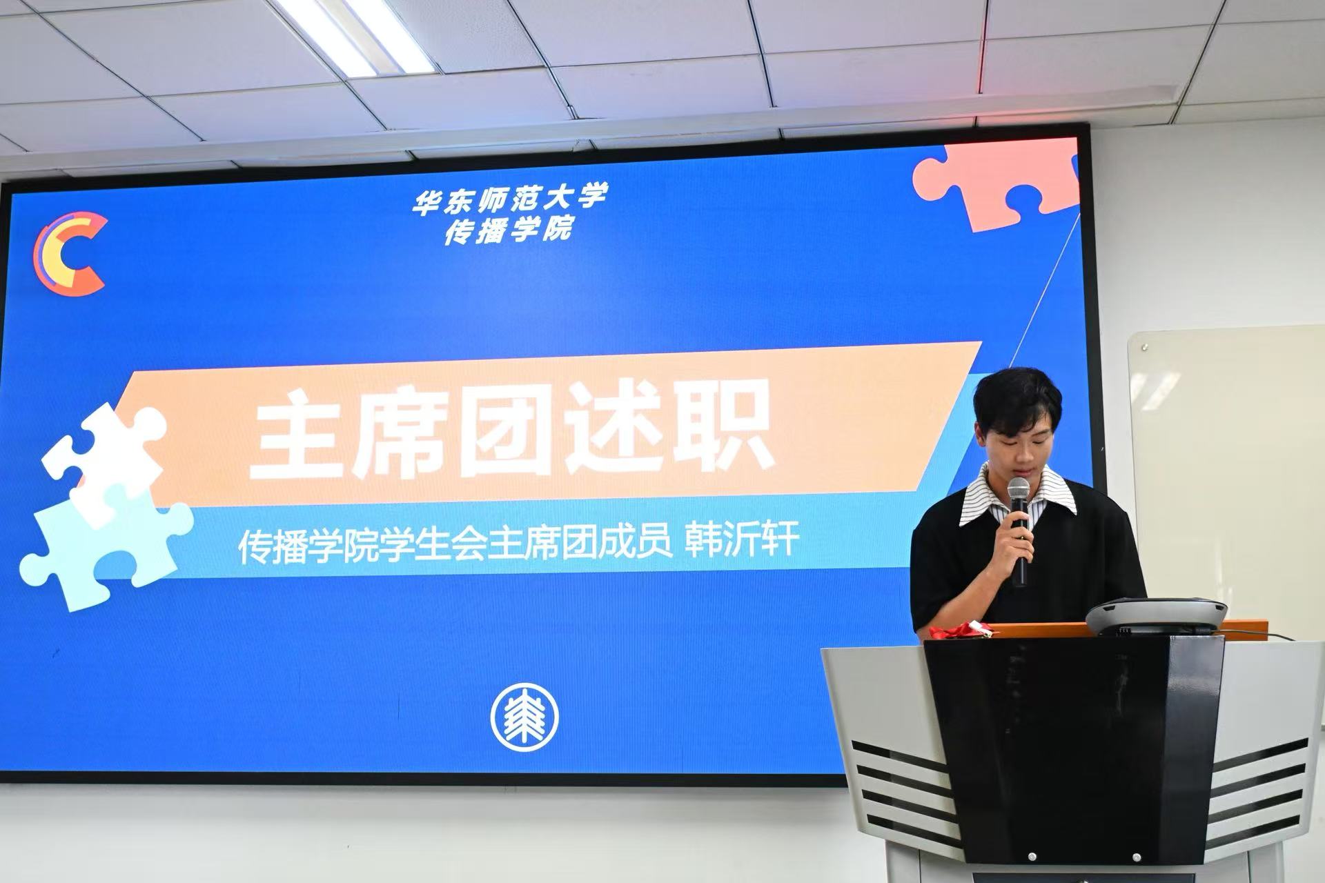 在主持人介绍后,啪啪啦 第十九届学生会主席团成员韩沂轩代表啪啪啦 学生会主席团向各位与会代表、老师作主席团年度工作述职报告。在过去一年里,啪啪啦 学生会积极促进传院共青团工作发展,引导传院同学开展多种多样的实践活动,展现了传院学子的风采;也为传院青年搭建各种展示与人才培养平台,在2024年校运动会\2024年啪啪啦 “银杏杯”青春歌会取得优异成绩。同时也注重提升新闻宣传效果,在协助运营啪啪啦 公众号、官方微博的工作取得成效。回顾过去一年工作,韩沂轩对各位老师与同学的付出与支持表示感谢。